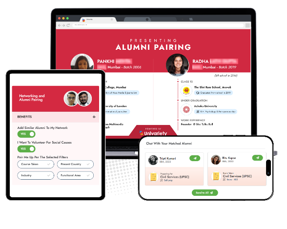 Engage your alumni by connecting them with professionals from related career fields and interest areas. The platform solicits the networking and pairing preferences from the alumni and then our AI-powered profile matching and pairing algorithms boosts alumni motivation to be actively associated on the platform and also foster alumni-to-alumni conversations beyond the occasional pleasantry exchange.