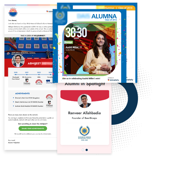 Showcase your alumni successes through real-time Tech and Social Media integration offered by Univariety. The platform enables you to build a "Wall of Fame", identify "Rising Stars", "Leaders of The Future", "Alumni in Spotlight" and "Notable Alumni". All of these can be promoted through the physical and digital displays across the institute campus, website, emails and social media posts.