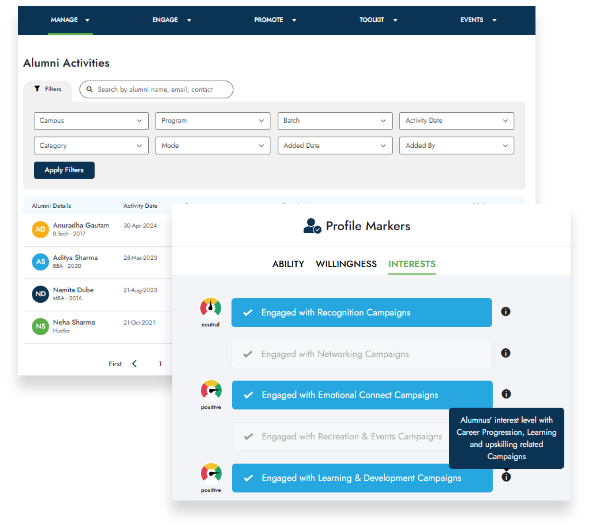 What's the point of planning the engagement and putting in efforts if they are not properly being tracked and measured? Track digital efforts as well as physical activities' impact on demand through interest based profile markers and engagement reports. This empowers the institutions to identify successful strategies and areas for improvement, optimizing future initiatives for alumni engagement.