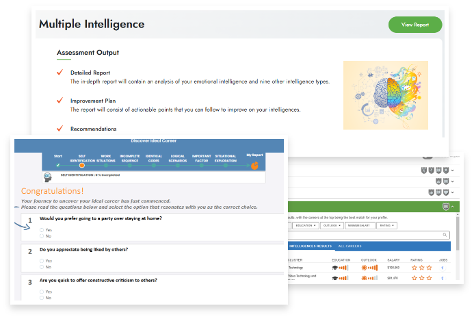 From the traditional Multiple Intelligence, Personality Type and Learning Style test to the innovative Ideal Career and Stream Selector Test our assessments cover it all.