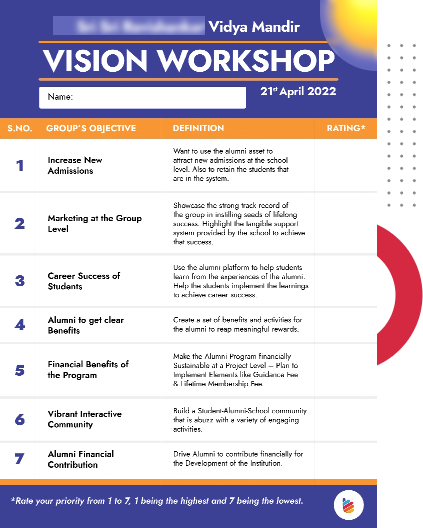 That's is where our expertise of driving alumni outcomes for over a decade comes into play. Through a "Goal Setting Workshop" we collaborate with the Institute Top management to introspect and finalize their objectives and expectations from the "Alumni Impact Program"