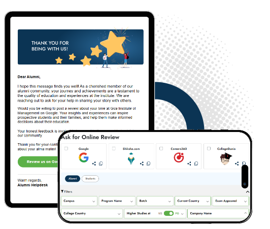 Our platform makes the entire review solicitation from alumni and current students - a matter of just few clicks for your marketing team.