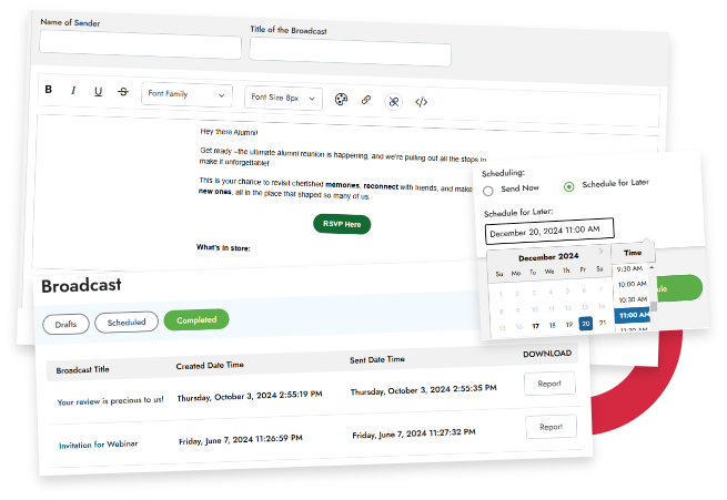 The broadcast feature allows you to define your target audience between prospective leads, current students or alumni, and send the email instantly or schedule for a later time.
