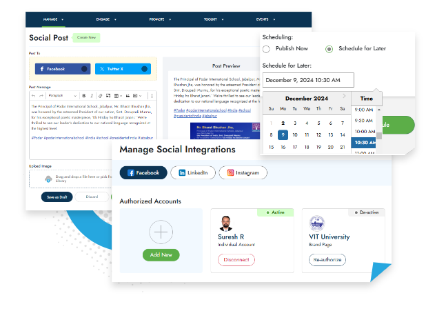 Manage your digital presence effectively by connecting your social media accounts and creating posts through pre-parked image templates and scheduling them.