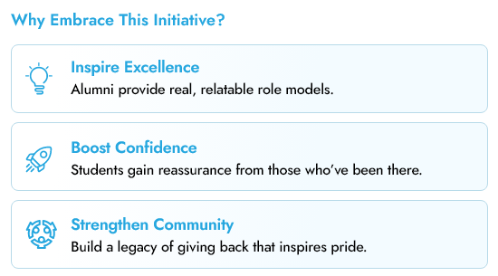 - Inspire Excellence: Alumni offer students a real-world perspective, sharing personal experiences and achievements that encourage them to set ambitious goals.
