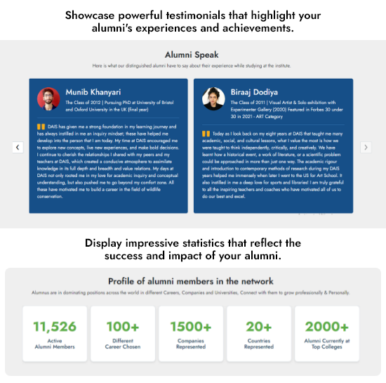 - With our widgets, you can showcase powerful testimonials that highlight your alumni's experiences and achievements.