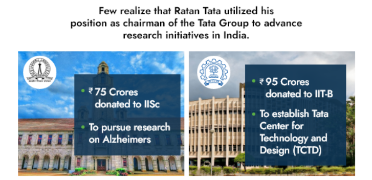 - He donated ₹75 crores to IISc for Alzheimer’s research & ₹95 crores to IIT-B to establish the Tata Center for Technology and Design (TCTD).
