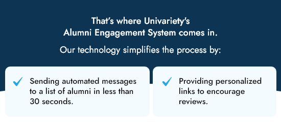 Your alumni are your school's strongest advocates. Their stories and successes are invaluable, but gathering these testimonials can be challenging. Alumni and parents are often busy, and a single request for a review may not be enough, Here’s how we can help you-